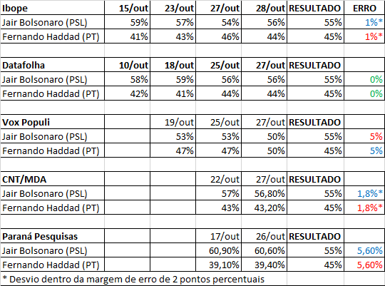 Sempre divisoras de opiniões, pesquisas eleitorais para a disputa presidencial brasileira saíram das urnas com maior ou menor grau de sucesso neste domingo, 29. Entre os cinco principais levantamentos do País, três acertaram o resultado dentro da margem de erro. Entre esses institutos, o Datafolha foi o que melhor previu o cenário eleitoral, "cravando"vitória de Jair Bolsonaro (PSL) com 55% dos votos válidos em levantamento divulgado no sábado antes da disputa. Segundo instituto mais próximo do resultado, o Ibope divulgou pesquisa no sábado, na qual o presidente eleito apareceu com 54% dos votos. Confira resultados das principais pesquisas eleitorais do País: